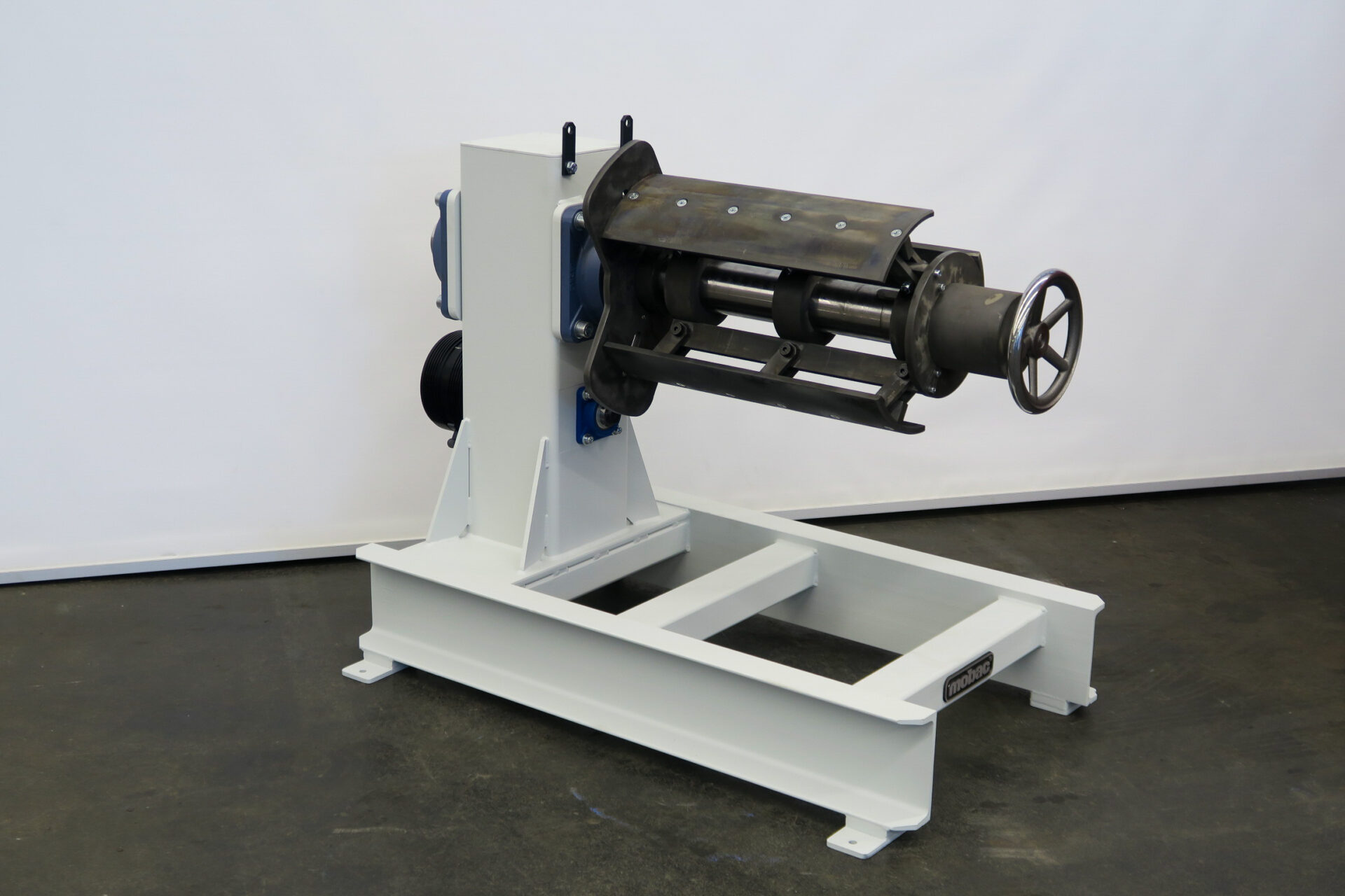 Tangentialabläufe mit Pinolenspannsystem nutzen eine Handhebelhydraulik zum Anheben und Spannen der Spule für effizientes Abwickeln.